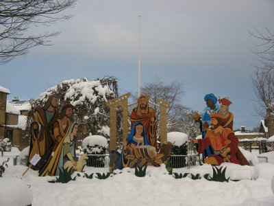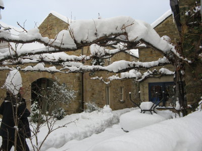 So no more snow but the drifts were worse. No guests departing from our peak district cottages and the ones who left yesterday only got as far as Uttoxeter before stopping and spending the night there. Spent the morning ironing (as had washed some curtains yesterday despite everything else going on) and housework. Andrew came up early afternoon and cleared the drive again. Must take a picture of the big load of snow cleared from the bottom of the drive. We then took some of the guests down to Bakewell so they could do a bit of shopping and have a break from Bolehill. I was surprised at how much snow there was in Bakewell. One resident said he had never seen so much snow in the forty or so years he had lived there. None of the banks were open but got some shopping, took some pictures and had a tea in one of the open coffee shops. ‘Admired’ the Xmas tableau which Bakewell has this year. Not the same as an Xmas tree! Cold night expected nationwide.