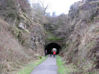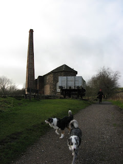 With a mild Christmas Eve forecast we had already decided on our walk for the day. Even though we haven’t had a walk for a while we had chosen a six mile walk and with the advantage of two cars it was a linear walk. First we drove over to the car park at High Peak Junction and left one car there then over to Brassington where there is a small picnic spot with car parking. From here we walked up to the High Peak Trail at Harborough Rocks and then set off back to Cromford. The first half of the journey was easy going taking us past some works and quarries and old station buildings with information points. I had hoped we might get a glimpse of Carsington Water but we didn’t. Middleton Top was the half way point and with a little Visitor Centre and cafe (open!) a good point for a cup of tea in the wintry sunshine. Middleton Top is the last surviving complete winding engine house for the Cromford and High Peak Railway and still has its original pair of beam engines. It looked an interesting building so we will try and see it on one of its open days in 2012. It was used to help pull the trains up the Middleton Incline. From here it was mainly downhill, first passing the National Stone Centre and then the Steeple Grange Light Railway (still to visit). At Black Rock the trail was a lot busier as we had only passed a handful of walkers and cyclists to this point and it had also started to drizzle but this had stopped by the time we got back to the High Peak Junction. Chris and friend went off to get the other car leaving me with friend and dogs and we walked the mile or so along the canal to the Cromford Wharf Cafe and waited for the lads to return. On the way home to our peak district cottages we stopped at the Massom Mill for a brief bit of retail therapy and we finished off the evening with a chinese takeaway.