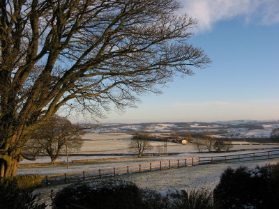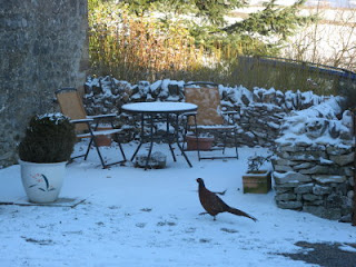 As soon as I woke up on Saturday I knew it had snowed by the colour of the daylight.  First things first Chris went out to start clearing the drive and I followed.  There was a covering of about 1/2 inch so it did not take too long to shovel and grit.  Eggs delivered from Green Cowden Farm, probably the last weekly delivery for this year as they are laying less due to shorter days and cold weather.  After a late breakfast Chris took me  down to the Farmers Market.  A couple of stalls were missing but most of what I usually get I was able to buy and having Chris with me meant I bought a few different things too.  We also called in at Elliots who install log burning stoves as we plan to replace the stove in Shippon.  Back home I did the last of my bits in the three cottages that were arriving later in the day at our peak district cottages.  All three have been a number of times before.  All arrived between 3.30 and 4.30 pm.  Took some pictures including our resident pheasant, view from my office, cows in the paddock from Derwent and views from the front door. All eyes on the weather.