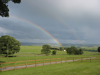 Tuesday was forecast to be a wet day but in reality the rain didn’t materialise until the evening giving our guests a full day to enjoy themselves. For me I went down to Bakewell in the morning and in the afternoon finished off some accounts from the last quarter. On Wednesday I pottered around the house trying to sort out belongings, this summer I would really like to have a good clear out but so far have managed few hours here and there. Chris disappeared down to the Village Hall for a few hours as they are still sorting out the telecommunications. A storm in the afternoon freaked the dogs out, Blue disappeared into the downstairs loo again! In the evening I collected Joanna and we went to the WI Presidents house in Bakewell for our monthly committee meeting. On Thursday morning Chris and I took a few hours off and went to Matlock. We are looking for a new kitchen table and with a selection of shops and manufacturers in Matlock it was a good a place as any to start. We also had a little stroll through Hall Leys Gardens in the centre of town which had just celebrated its centenary. They were looking very nice. We had lunch out then came back home and after a quick check on emails and phone calls went down to Bakewell for a haircut and get provisions for the weekend. When I came back Chris was helping get the cows in (with Smudge) as Andrew and Joana had gone to Fay’s graduation ceremony. A quiet evening in catching up on blogging! Here’s a nice picture of a rainbow taken from our peak district cottages.