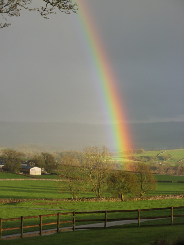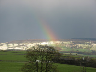 Thursday was another day of sunshine and showers. The morning sun felt very warm when I took the dogs for their walk at our peak district cottages. Chatted to some of the guests as they were leaving for the day. One has already booked for another week later this year. Three cottages out and one cleaner up. The morning just seemed to fly by but I took a number of bookings which made up for a couple of cancellations. After lunch I had planned to go to Bakewell but that was delayed by an unexpected visitor. An elderly gentleman with his daughter called in. He had been evacuated here during the war to stay with his uncle and aunt. Over a cup of tea he was able to give us some more information about Bolehill which we can add to our knowledge of the farm and the daughter has said she will scan and email some photos to us. Went down to Bakewell later to get provisions for the weekend and Chris came too. Back home a late evening shower turned into a little storm with thunder and lightening leading to traumatised dogs. The rain turned to hail and we watched the storm cross the hillside at Stanton leaving a white covering of hail and a rainbow to finish it off.