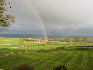 Monday was Easter Monday. It rained. It rained most of the day. Typical bank Holiday Monday! One cottage out and two back in with one cleaner up. No problems encountered and both cottages arrived just after 3pm. Rained eased off late afternoon so took the dogs for a walk. We have quite a few dogs here again this week at our dog friendly cottages. Tuesday was a lot brighter with the threat of showers. With no arrivals or departures we decided to go to Ashbourne as we haven’t been there for a while. First stop was the recycling centre then the garden centre where I bought some plants of course! Then we had a wander round town. Disappointed to find one of the deli’s closed but still many food shops remaining. A few new shops to browse as well and luckily only saw one shower which made us wonder if we could have gone for a walk but some of our other guests said they had been caught in a few more showers so it did depend on where you were. On the way back we did a detour to call in at Bakewell to pick up some supplies from the agricultural store including some compost for my hanging baskets. I also called in at our WI President as I needed some cheques signing. Wednesday was similar to Tuesday weather wise. In between showers did some gardening and Chris added some shingle to the paths. Some evening showers produced a nice rainbow display. After dinner Chris and I collected Joanna and Andrew and us ladies went to the monthly WI meeting while the men went for a drink at the Lathkil. First they had to help our speaker, a cousin of Andrews, who had come to give us a cookery demonstration, bring in all the goodies from her car. The advantage was at the end of the evening they were also able to sample her cooking just like the ladies!