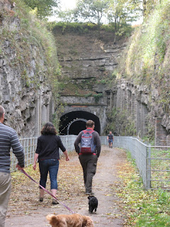 Monday was a day of arrivals at our peak district cottages with five cottages in. One cleaner up to finish any required cleaning. Still quite pleasant day weather wise. Guests started to arrive just after 3pm, one has been before. Had expected a very late arrival so had cancelled my attendance at the Over Haddon Village Hall Committee although in the end they arrived late afternoon. Chris went out to the Bakewell Photographic Club in the evening. Tuesday was a lot fresher but it was our day off. We had been meaning to try a cycle ride on the Monsal Trail since it opened and we decided it would be quieter by now. When we have walked on the trail we have seen dogs accompany cyclists so we thought our two would also enjoy an outing. We had thought about hiring electric bikes but was told you have to book at least a week in advance – more in high season! I noticed they had tricycles as well as tandems. We booked two adult bikes and after I had a practise ride around the Hassop Station car park we set off towards Buxton. It must have been confusing for the dogs as were able to keep up with them. Also being on a bike meant I couldn’t keep stopping to admire the scenery or take photos! For the first time too we went through the Headstone Tunnel under Monsal Head. I wasn’t sure if I was very unfit as I was finding the cycling quite difficult until Chris pointed out that the trail from Hassop to Millers Dale was actually uphill (not noticeable if you are walking it). I had had enough by the time we got to Millers Dale even though we had stopped a couple of times. We used one of the picnic benches at Millers Dale to have lunch and were joined at the neighboring tables by a walking group who we had passed. The dogs were happy as they realised they could cadge some food from some other people! We then set off back to Hassop Station and for most of the way were able to freewheel! Despite it only being mid afternoon the amount of walkers and cyclists had already decreased. Time for afternoon tea at Hassop Station and here are a few pictures that I did take including the entrance to Headstone Tunnel where suddenly there were people around!