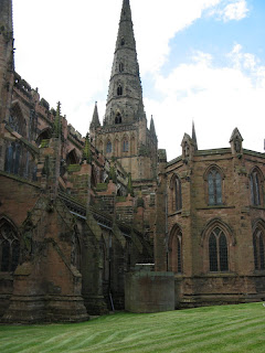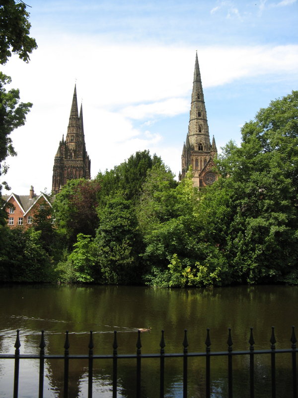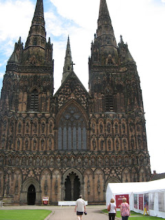 On Thursday I went on a coach trip to Lichfield about 40 miles away from our peak district cottages.  This was organised by a WI lady from Monyash and Joanna and I thought it would be nice to go.  Chris dropped us off near the Lady Manners school just before 9am and after picking up some others in Bakewell and Ashford we were off.  It didn’t take long to get there via Ashbourne and there was still some flooding near Sudbury.  Lichfield is worth visiting if you are nearby for a couple of reasons, the Cathedral and Dr Johnson’s House.  Apart from some nice stained glass windows the Cathedral also now houses some of the Staffordshire Hoard.  It is also  famous  for having three spires. Lichfield was in the middle of its arts festival so while we were wandering around around the cathedral we were listening to a practice session for a piano recital.  Thursday was a nice day so we also wandered around the streets, there were some independent shops as well as a central shopping area.  There are a number of regular weekly markets too.  Dr Johnson’s House was also worth a visit, he wrote A Dictionary of the English Language.  After lunch we walked through some parkland and along the ‘pool’ beside the cathedral before browsing in some shops.  On the way back I noticed some farmers were making the best of the weather and either silaging or hay making.  Home by 5.30.  Had a nice day out but missed a good day to get some gardening done.  Never mind.