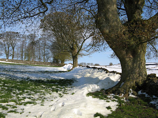 Woke up Thursday morning to bright sunshine and a thaw set in quickly at our peak district cottages. By lunchtime the courtyard was clear and by the end of the day the car park was passable which was just as well as I had three cottages in. Two cottages departed and my cleaner managed to get here. The road was now passable but in some places it was a single lane only and there was still piles of snow along the drive. Was able to see the damage done to my shrubs and plants. The daffs have been flattened, as have some of the flowering spring bulbs, and a couple of climbing shrubs have been pulled away by weight of snow. The wave effect of snow against the stone walls is quite stunning. Early afternoon I headed down to Bakewell to get provisions for the weekend. Should have taken the camera to photograph the snow by the road but by the time I got to Lady Manners it had gone. Bakewell was clear of snow but busy. First guests arrived about 4pm, they have been before, and remaining guests arrived about 7pm, one of which had also been before. Green Cowden Farm lost one lamb, but a search of the drifts revealed a sheep that had been covered by snow, alive but weak. They had had to ‘rescue’ some stranded motorists from the end of their drive. Andrew was supposed to have his milk collected but the tanker got stuck elsewhere so it looked like Andrew was going to have to throw the milk away as there is a time limit between milkings and collection. Luckily the tanker made it up the hill from Bakewell and collected it before the road got too bad. At the end of the day at least the landscape was more green than white.